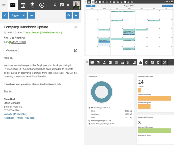 Business class Calendar, Contact and Notes support from Webmail and compatible clients for flexible working with CalDav, CardDav and EWS support.
